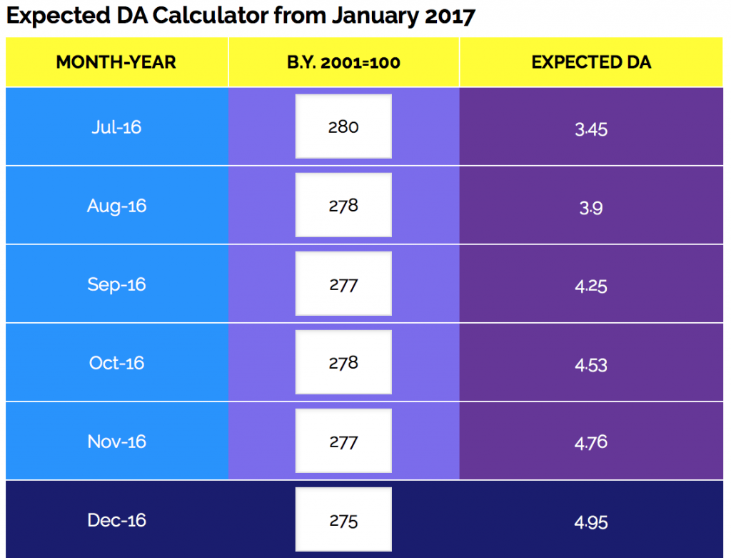 December ’16 AICPN ( 275 ) has been released yesterday (31st Jan 2017) with that DA is almost fixed @ 2% ( total 4%). Though this is not the final figure because the Union are protesting against the DA %. If there are any changes to DA%, we will update you at the earliest.