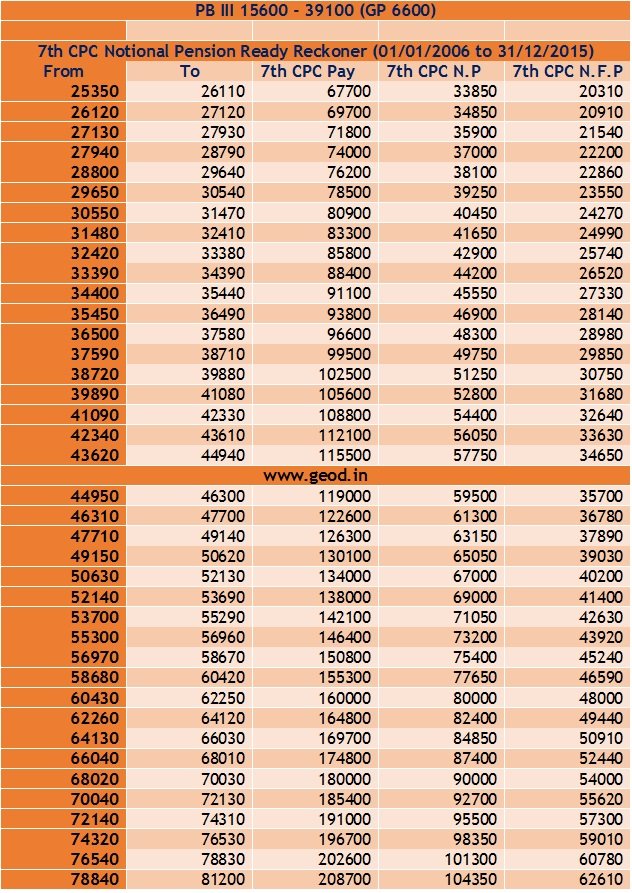 7th CPC Notional Pension Ready Reckoner – PB III GP 6600 (2006 T0 2015)