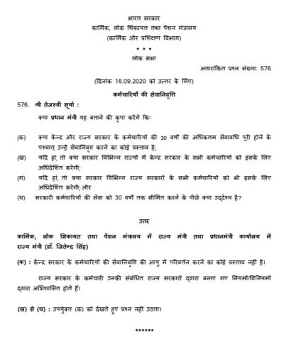Proposal to retire employees of Central and State Government after completing a maximum service period of 30 years: Govt. reply in Loksabha