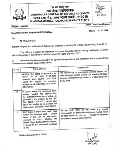 Date of next increment under Rule 10 of CCS (Revised Pay) Rules 2016: Points of doubt and clarification by CGDA