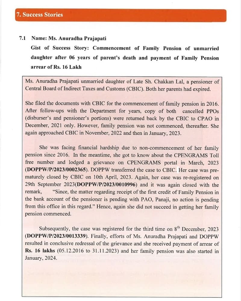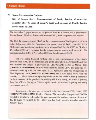 7.1 Name: Ms. Anuradha Prajapati Gist of Success Story: Commencement of Family Pension of unmarried daughter after 06 years of parent’s death and payment of Family Pension arrear of Rs. 16 Lakh