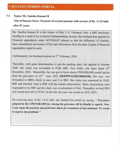 Overwhelmed with gratitude, Ms. Kumari lauded the CPENGRAMS portal, expressing, “Procedure adopted by the CPENGRAMS for closing the grievance till its finality is superb. Now, I can repay the pension and gold loan taken for treatment of late husband. No words to express my gratitude.”